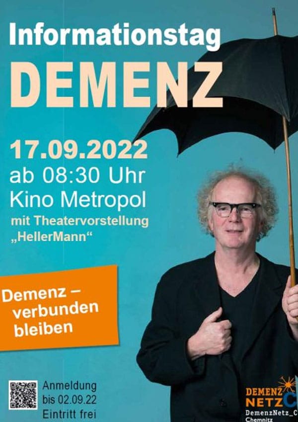 Das DemenzNetz_C möchte mit der Veranstaltung anlässlich des Weltalzheimertages unter dem Motto „Demenz – miteinander verbunden bleiben“ sensibilisieren sowie über die Erkrankung informieren und lädt zu einem interessanten Informationstag recht herzlich am Samstag, den 17. September 2022 von 8.30 bis ca. 15:00 Uhr in das Kino Metropol, Zwickauer Str. 11, 09112 Chemnitz ein. Der Eintritt ist frei.
