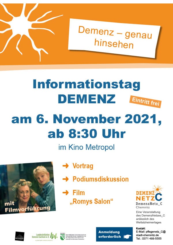 Das Demenznetz_C(hemnitz) lädt Sie zu einem interessanten Informationsforum am Samstag, den 6. November 2021 von 8.30 bis 14 Uhr in das Kino Metropol, Zwickauer Str. 11 in 09112 Chemnitz recht herzlich ein und freut sich auf Ihren Besuch.