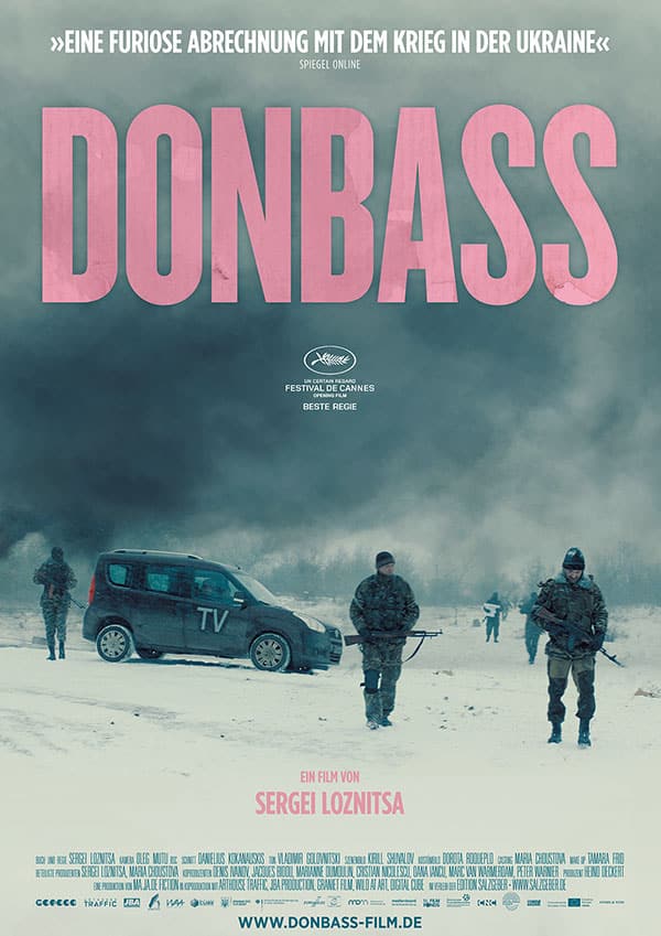 Der Donbass in der Ostukraine. Seit 2014 herrscht hier ein blutiger Konflikt zwischen ukrainischen Regierungstruppen und prorussischen Separatisten. In 13 kaleidoskopartigen, absurden Vignetten zeigt Regisseur Sergei Loznitsa ein Land, das zwischen informellen Machtstrukturen, Korruption und Fake News zerrieben wird. Eine Gruppe Schauspieler inszeniert einen TV-Beitrag über einen fingierten feindlichen Anschlag; aus Rache für einen vermeintlichen Rufmord kippt eine Politikerin Fäkalien über den Kopf eines Chefredakteurs; ein Mann führt durch eine weitverzweigte Bunkeranlage, in dem dutzende Menschen Zuflucht vor Feuerbeschuss suchen. Beschlagnahmungen, Kontrollschikanen und Prügelstrafen sind an der Tagesordnung. Der kalte Horror von Angst, Gewalt und Hysterie erfasst mehr und mehr Bereiche des Lebens und nimmt immer groteskere Züge an …