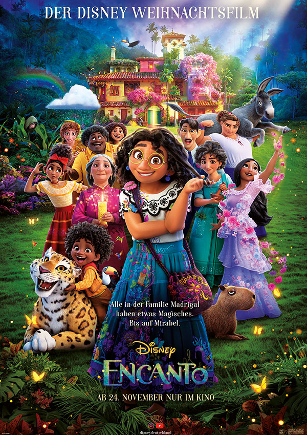 "Encanto" von den Walt Disney Animation Studios erzählt die Geschichte der Madrigals, einer außergewöhnlichen Familie, die versteckt in den Bergen Kolumbiens lebt, in einem magischen Haus, in einer lebendigen Stadt, an einem wundersamen, verzauberten Ort, einem so genannten "Encanto". Durch die Magie des Encanto wurde jedes Kind der Familie mit einer einzigartigen Gabe gesegnet, von Superkräften bis hin zur Fähigkeit zu heilen - jedes Kind, bis auf Mirabel. Doch als sie entdeckt, dass die den Encanto umgebende Magie in Gefahr ist, stellt Mirabel fest, dass sie, die einzige gewöhnliche Madrigal, die letzte Hoffnung ihrer außergewöhnlichen Familie sein könnte.