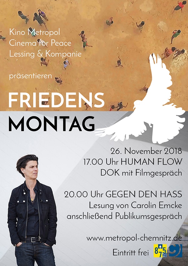 Liebes Publikum, wir nehmen das 875. Stadtjubliäum zum Anlass, für ein friedliches Miteinander in einer weltoffenen Stadt zu werben. Dafür öffnen wir entgegen unserer Gewohnheiten an einem Montag unsere Türen und laden alle Chemnitzer und Besucher zur Dokumentation Human Flow des chinesischen Künstlers Ai Weiwei und zur Lesung der deutschen Friedenspreis-Trägerin Carolin Emcke aus ihrem Buch Gegen den Hass in unseren Saal. Gemeinsam mit Ihnen und weiteren Gästen wollen wir darüber ins Gespräch kommen, der Eintritt ist für beide Veranstaltungen frei.