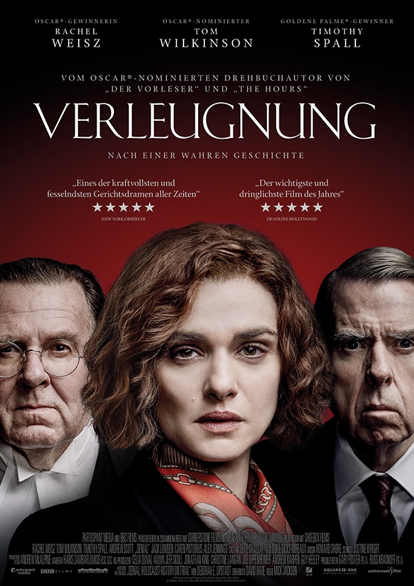 Basierend auf dem Buch „Betrifft: Leugnen des Holocaust“ der Historikerin Deborah E. Lipstadt, das der Oscar®-nominierte Autor David Hare („Der Vorleser“) für die Leinwand adaptierte, brillieren Oscar®-Preisträgerin Rachel Weisz („Ewige Jugend“, „Der ewige Gärtner“) und Timothy Spall („Mr. Turner - Meister des Lichts“) in zwei der herausragendsten Rollen des Jahres. Regisseur Mick Jackson („Bodyguard“) inszeniert mit VERLEUGNUNG ein aufwühlendes Drama nach einer wahren Geschichte.