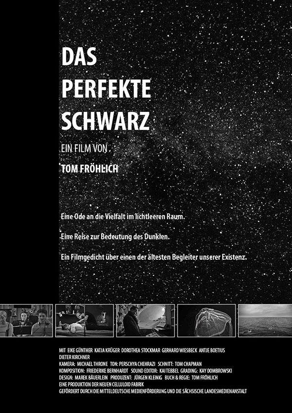 Sechs Menschen offenbaren ihre eigene Interpretation vom perfekten Schwarz und ihre Suche danach. Eike Günther ist Astrophysiker und hat sich auf die Entdeckung erdähnlicher Planeten spezialisiert – das perfekte Schwarz kann er definieren, aber nie finden. Das Echo des Urknalls ist schließlich überall. In den Tiefen unserer Ozeane, dort wo kein Licht hinfällt, gibt es Leben. Die Meeresbiologin Antje Boetius erforscht es. In der schwarzen Tiefe fühlt sie sich zu Zuhause. Es ist der Moment, in welchem Menschen ihre Masken fallen lassen, meint der Tattoo Künstler Gerhard Wiesbeck und färbt mit der Tattoonadel eine Hautfläche schwarz. Synästhesisten können Farben mit Tönen verknüpfen. Katja Krüger hat diese Fähigkeit und als Musikerin kann sie ihr perfektes Schwarz hörbar machen. Dorothea Stockmar ist Künstlerin und ausgebildete Trauerbegleiterin. Sie sagt, das perfekte Schwarz ist wichtig, weil es allem die Kontur gibt. Der Kunstdrucker Dieter Kirchner hat Jahre gesucht, bis er sein Schwarz in einem Obsidian-Stein fand. Vor diesem Hintergrund lässt er in seinen Drucken Abbilder hervortreten. Was ist das perfekte Schwarz? Vielleicht lässt Tom Fröhlichs Film diese Frage offen, aber man ahnt: es ist einer der ältesten Begleiter unserer Existenz. Und wo könnte man besser über die Bedeutung des perfekten Schwarz nachdenken als im Kino? Jener dunklen Höhle, die uns vor dem Draußen beschützt.